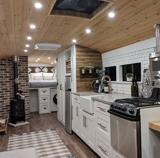 It’s the touch of nature, the rustic-meets-modern ambiance, and the fact that it’s all wrapped up in a mobile adventure package that makes the couple’s look so popular. When they installed their wood stove, a Hobbit from Salamander Stoves, a mini frenzy broke out over its cuteness. Our favourite part though, obviously, is the ECOFAN they have on top. It makes sense, having the length of a bus to get warm air flowing into, and if they didn’t think of it themselves, we gladly would have sent one along in exchange for a couple images of an AirMax inside their gorgeous home.